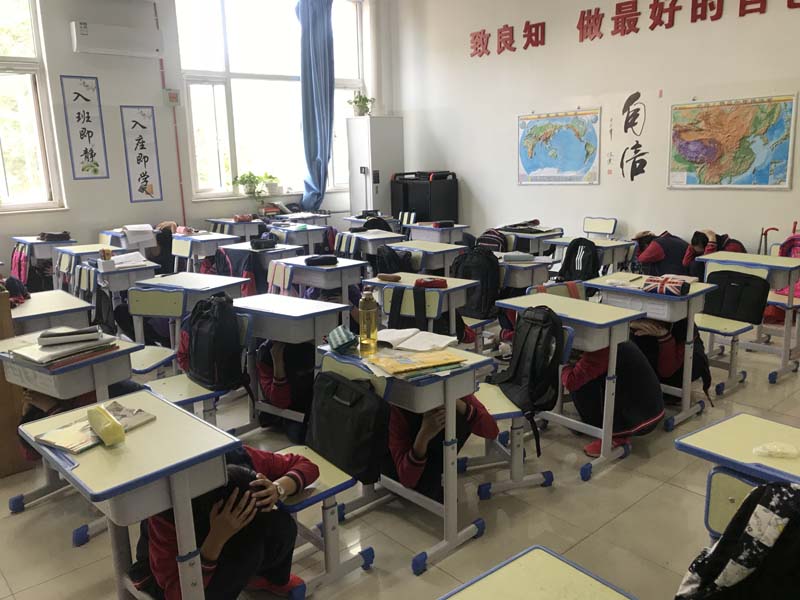教学区:信号员发出“地震警报”信号,各班上课老师大声命令:“地震、地震,躲到桌下、躲到桌下”。值班保安迅速打开南北两侧大门。学生迅速蹲下,躲在课桌旁,并用书包或书本保护头部。参加演练人员就地避震,约一分钟。