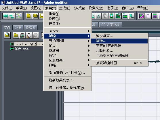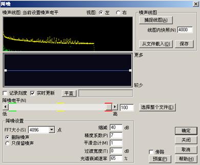 在降噪对话框中按下“捕捉线图”对噪音进行采样。采样完毕后,关掉对话框,并转到多轨模式下删除噪音片断。