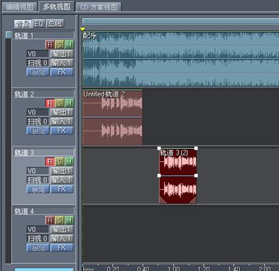 可以将自己的声音分段录入,便于处理。录音的时候要确保轨道的录音开关处于打开状态,再按下录音按钮,录音完毕再关闭录音开关。我们将自己的两段声音分上下两段分别录到了2、3轨,如下图。
