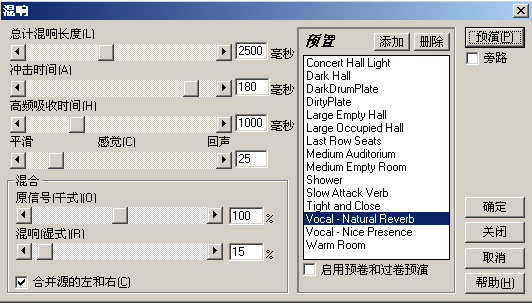 在混响效果面板中,可以在右侧选择预置的效果,点击“预演”可以进行试听,调整到合适的效果后点“确定”进行处理。