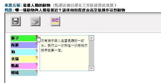 对类似上述的排序问题,可以使用排序工具。下面提供网页中的排序工具实例,是小组学生对“哪一种动物与人类最接近”的构想。