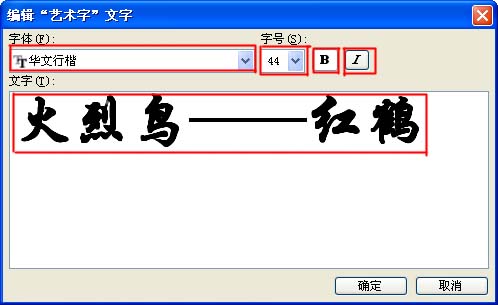 3.如下图,在编辑“艺术字”文字框中,输入文字,设置字体、字号、加粗、倾斜等格式,然后点击“确定”按钮。在这里,我输入了“火烈鸟——红鹤”,选择的字体是“华文行楷”,字号是“44”,加粗。