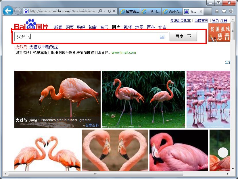 2.在输入框中输入自己搜索的内容,然后点击“百度一下”按钮。我要搜索火烈鸟的图片,就输入“火烈鸟”三个字。