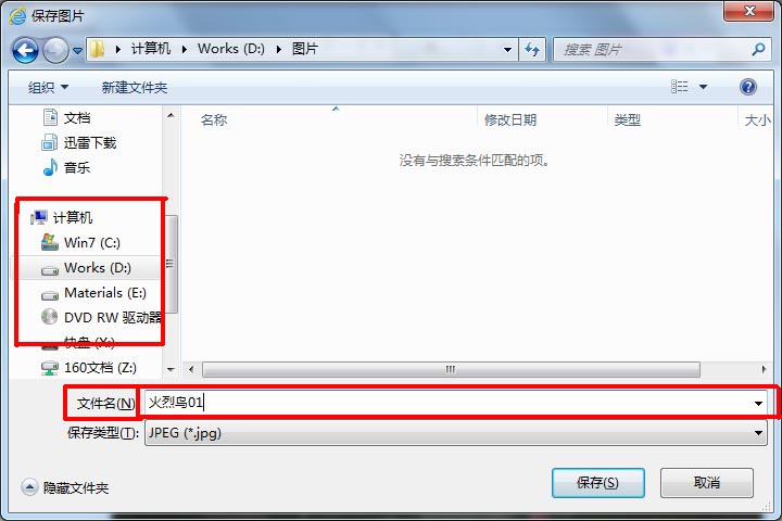 4.从左面选择文件存放位置,然后在空白框中输入文件名,这里我输入“火烈鸟01”,然后点击“保存”按钮,文件保存成功。