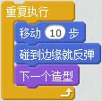 现在这个脚本的意思是:在点击绿旗时,先把角色大小设定为100%,然后重复执行“移动10步、碰到边缘就反弹、下一个造型”三个模块。