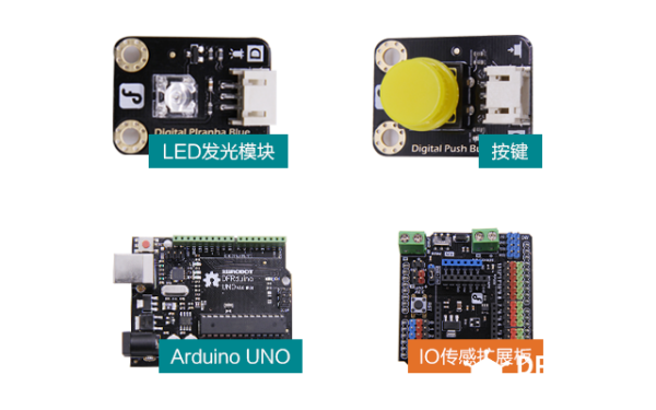 本模块所需元件:Arduino UNO、IO扩展板、LED灯、按键。