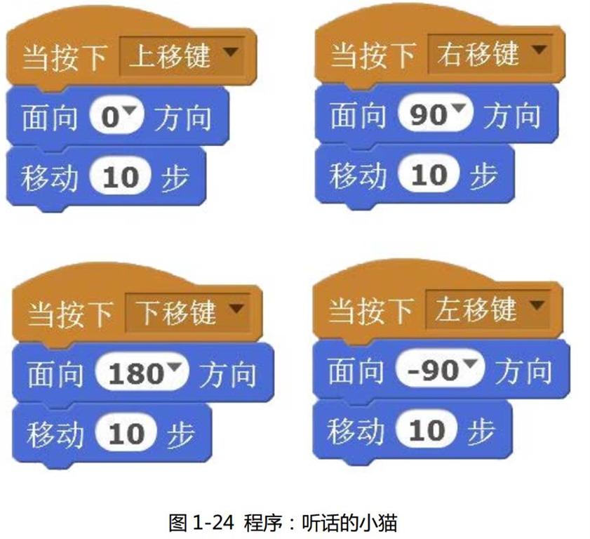 今天我们要完成的第二个任务是“听话的小猫”。任务描述:按键盘上的“上、下、左、右”键,可以让小猫先转向相应的方向,再移动 10 步。程序如下(参见图 1-24):