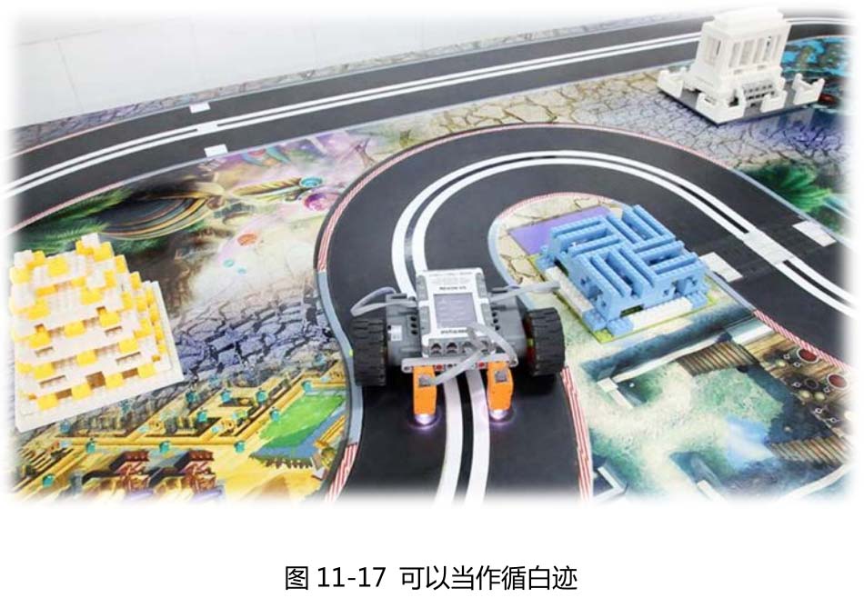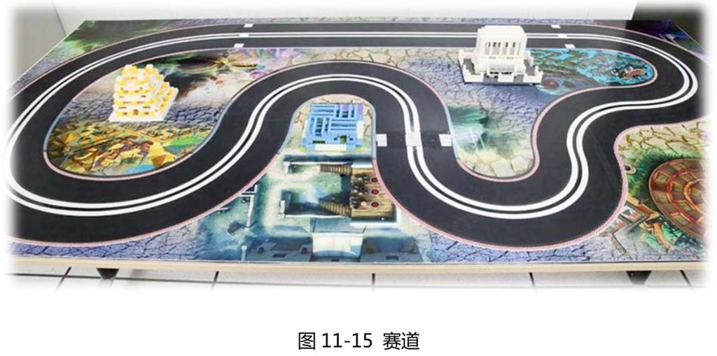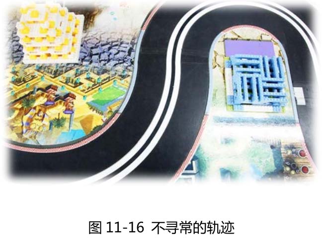 仔细观察可以发现这张赛道的“不寻常”之处,主要是轨迹的样子(参见图11-16)。两边是黑色,中间是两道白色,最中心是一道黑线。