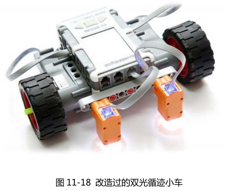 如下图,把今天的双光循迹小车改造一下,就可以当作是“循白迹”了(参见图 11-17)。