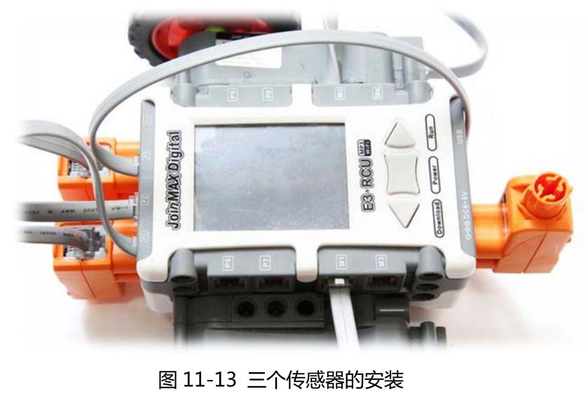 上图是从侧面看,可以看到触碰传感器安装在了控制器的 P3 口上。(左边的光电传感器是 P1 口,右边的光电传感器是 P2 口。)