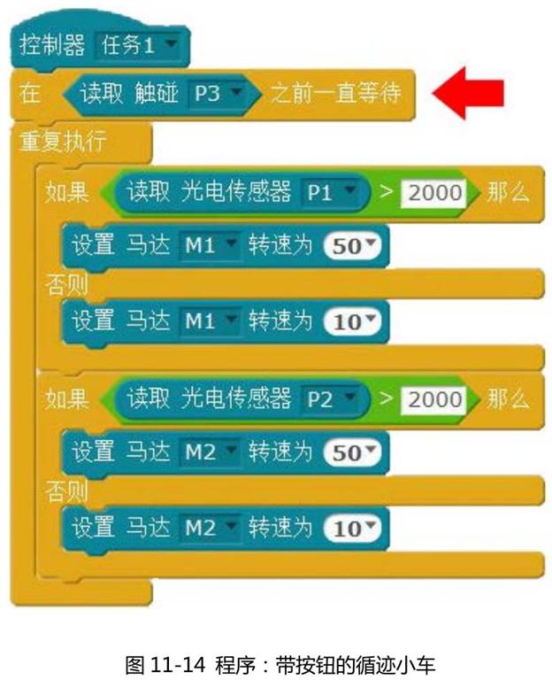 比起“任务一:双光循迹小车”的程序,仅仅多了一个等待指令。在按下触碰传感器之前小车是静止的,当裁判发出口令“跑”时,按下触碰传感器,小车就进入了循迹的程序块中。