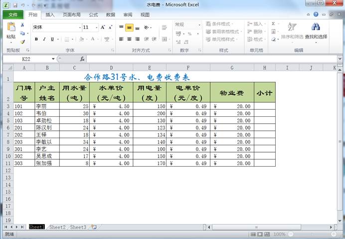 (1)打开“水电费”工作簿,单击“Sheet2”工作表标签,选中该工作表。