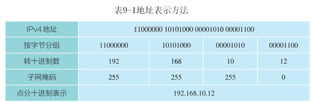 IPv4是指IP第四版的协议,对应的地址为IPv4地址。它是一个32位的二进制数值,为了便于表示,按8位一组共分4组,再按组换成十进制数并用圆点相连,即点分十进制表示(如表9-1)。由于点分十进制表示的IP地址每一段是由8位二进制数转换而来的,因此它每段的取值范围在0~255之间。