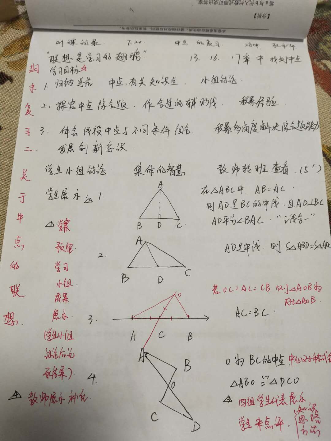 总结与反思:本节为期末复习课,中点的联想很好的为我们展示了如何进行几何期末复习。着力于中点展开的教学活动。充分体现了学生是主体,教师是组织者。本节内容非常细致,由中点展开联想到线段平分点,平分面积,中心对称式全等,等腰三角形三线合一,直角三角形斜边中线的性质等等。全程从知识点总结,点评,做题展示补充点评都由学生来完成后教师再来补充。提问有心思。问题有重点。遇到易错题。易错点时放慢速度,并及发问、鼓励学生勇于挑战。课堂结构清晰。备课充分。体现了联想的重要性,是一场思维的活动。反思自己的不足:知识性备课不够深入,没有发挥每位学生的主体作用,课堂对学生的启发不够......这些都是今后教学中需要注意的。 |