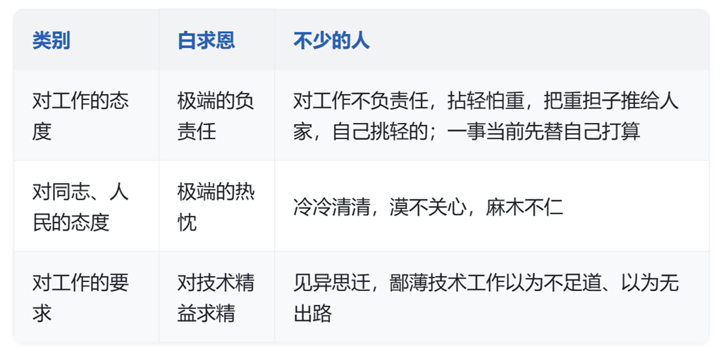 | 对工作的态度 | ① 极端负责(“对工作的极端的负责任”) | ④ 不负责任(“对工作不负责任,拈轻怕重”) | ⑦ 通过对比突出白求恩的高尚品质,批判不良作风 |
