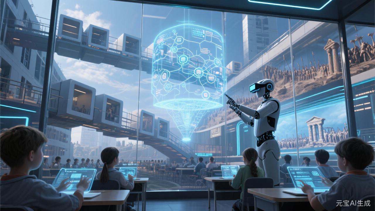欢迎来到未来课堂!在这里,知识以绚丽的全息模型触手可及。我们的机器人导师正通过VR沉浸式演绎课程核心,将抽象概念化为生动影像。学生们在智能平板上与知识互动,窗外是历史长河的壮丽投影。