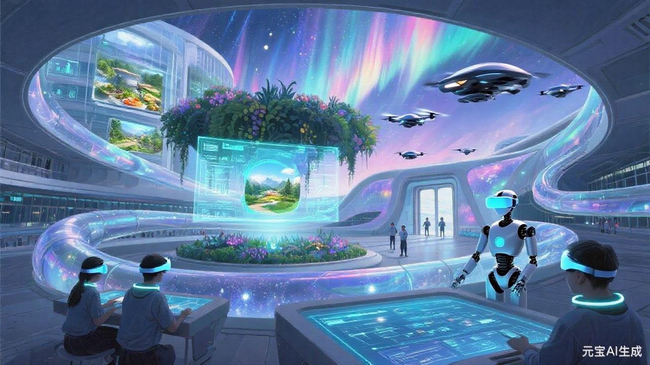 透明回廊缠起科技与生机,触控桌流淌着世界万象:孩子指尖划过的是星际航线,桌角盛着的是刚摘的浆果甜。没有“未来某一天”,只有此刻——让科幻浸在烟火里,让每口呼吸都裹着科技的轻盈、自然的温柔,把日子过成极光下的诗行。