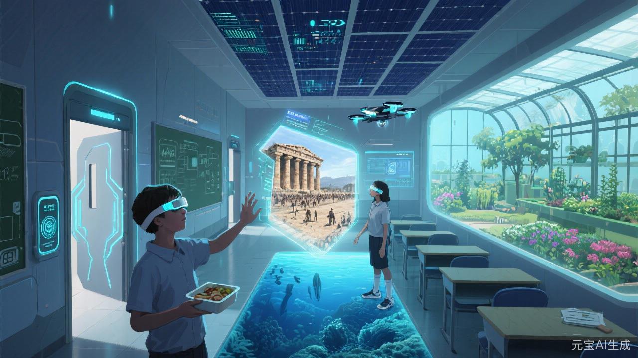 推开未来校园的教室门,脚下直接是晃悠悠的深海珊瑚,抬手就能摸到帕特农神庙的柱子!头顶有太阳能顶篷透着光,全息投影把全世界都搬进课堂里,连餐盘里的饭都带着新鲜劲儿。这儿的课本就像任意门,上课哪儿是读书啊,明明是穿越山海、跟老祖宗的文明聊天;窗外有花园,屋里有全息景儿,成长就该这样——一半吹着自然的风,一半裹着未来的光。