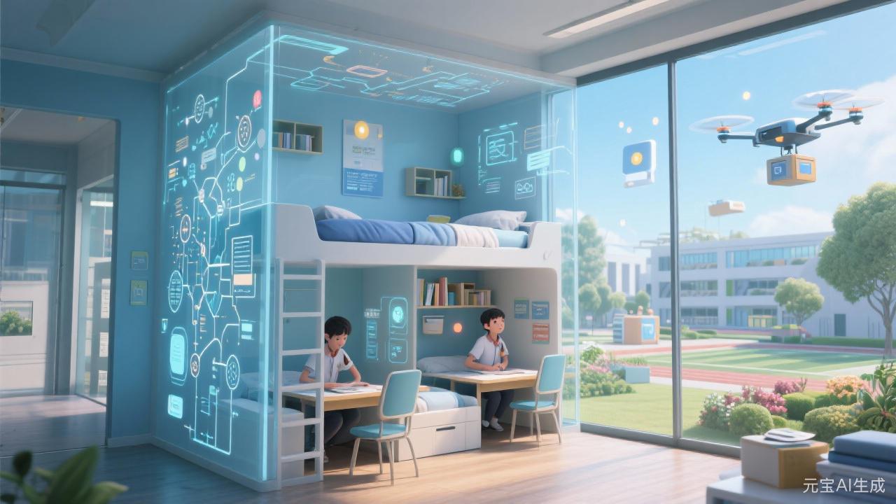 这是让未来“长”在校园里的天地:宿舍的全息光屏随指尖铺展知识,食堂的机器人厨师端出定制营养餐,课堂的悬浮投影让课本里的生命“游”进视野,庭院中AR眼镜解锁万物的微观密码,无人机把惊喜送进窗台。