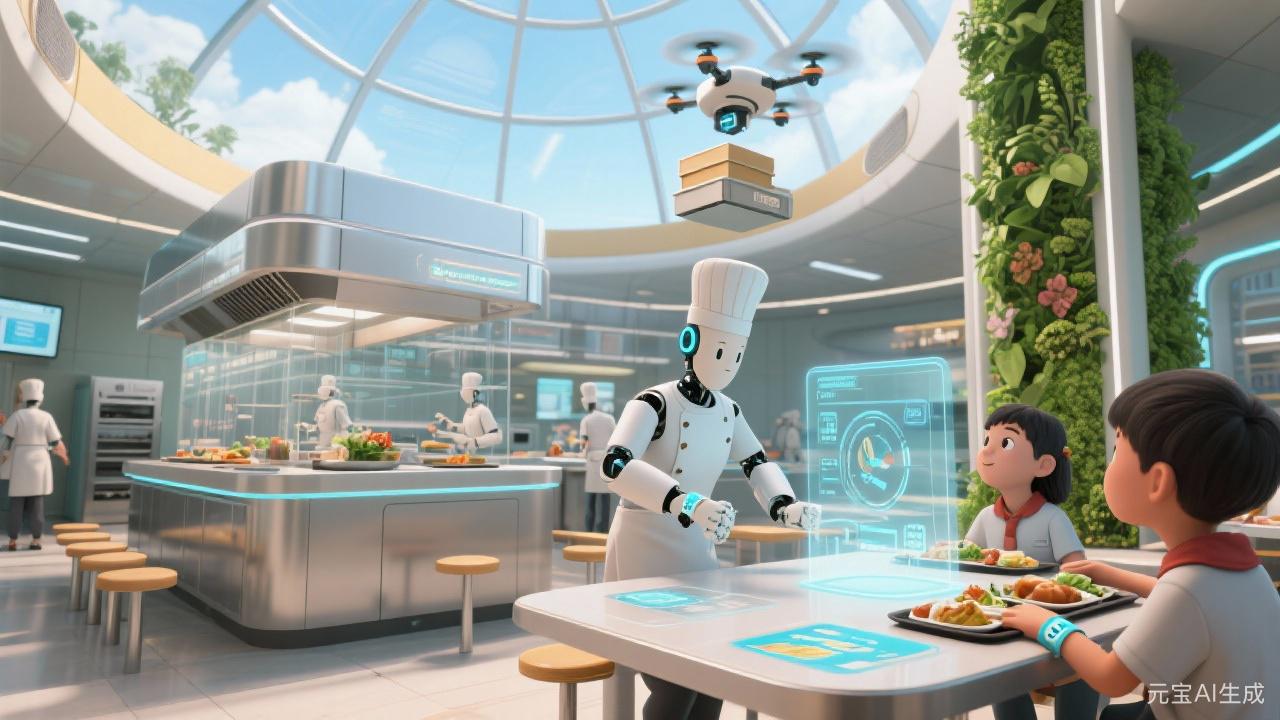 这是让未来“长”在校园里的天地:宿舍的全息光屏随指尖铺展知识,食堂的机器人厨师端出定制营养餐,课堂的悬浮投影让课本里的生命“游”进视野,庭院中AR眼镜解锁万物的微观密码,无人机把惊喜送进窗台。