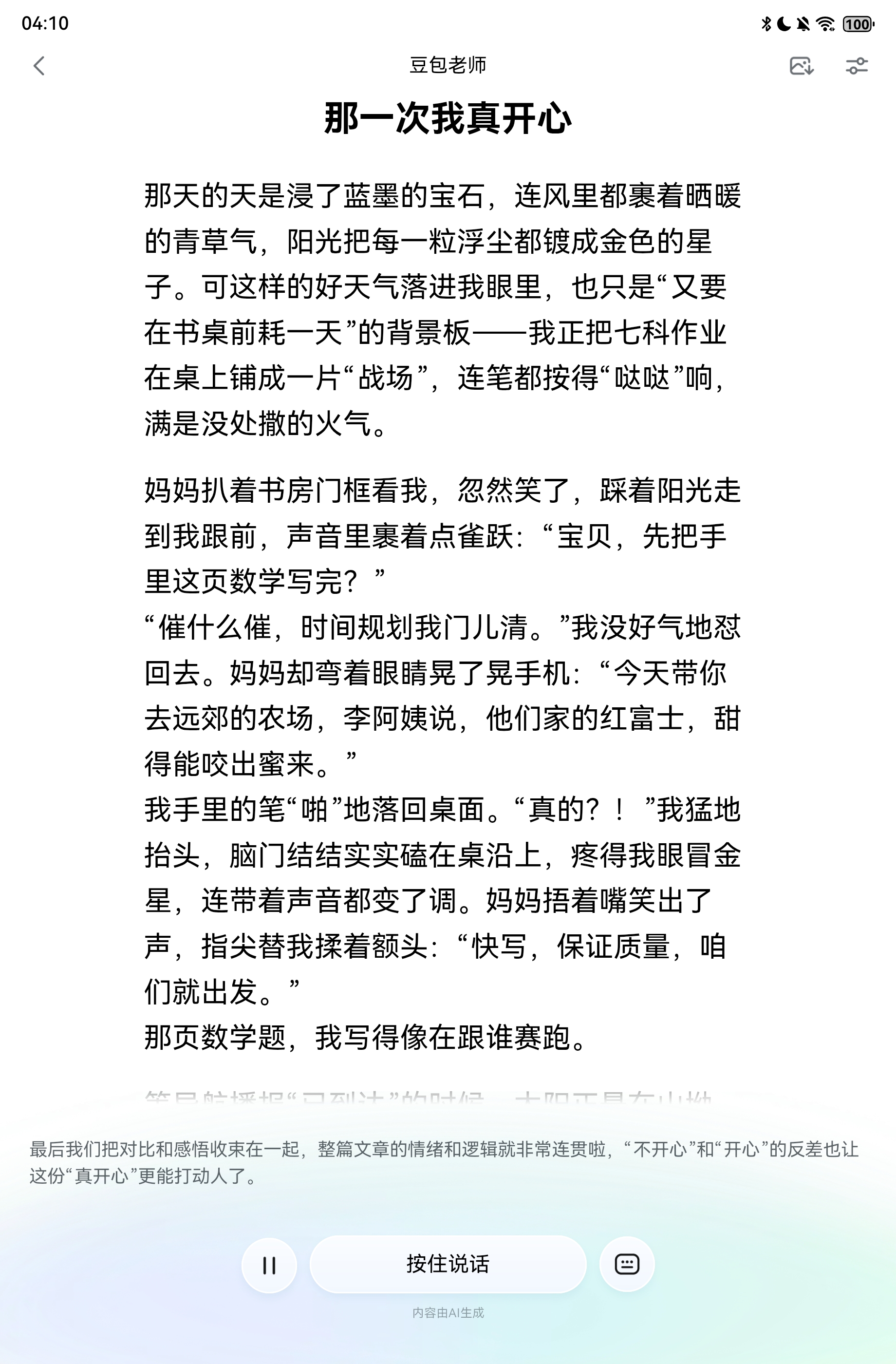 “干嘛呀,别催了,我们政治课上学过时间规划呢。”我不耐烦地嘟囔着。妈妈微笑着说:“今天我打算带你去农场摘果子。”“真的?”我瞬间两眼放光,兴奋地喊道,“行,我这就快去写。”妈妈叮嘱道:“但一定要保证质量哦。”我像小鸡啄米似的疯狂点头,结果用力过猛,脑袋“砰”地一声狠狠撞在桌子上,撞得我眼冒金星。妈妈看着我狼狈的样子,忍不住“扑哧”一声笑了出来。“你,你笑什么呀。”我揉着撞得发昏的脑袋,不满地说道。妈妈笑着说:“好好写,我去开车了。”“哦。”我又一次投入到数学难题的“战斗”中。
