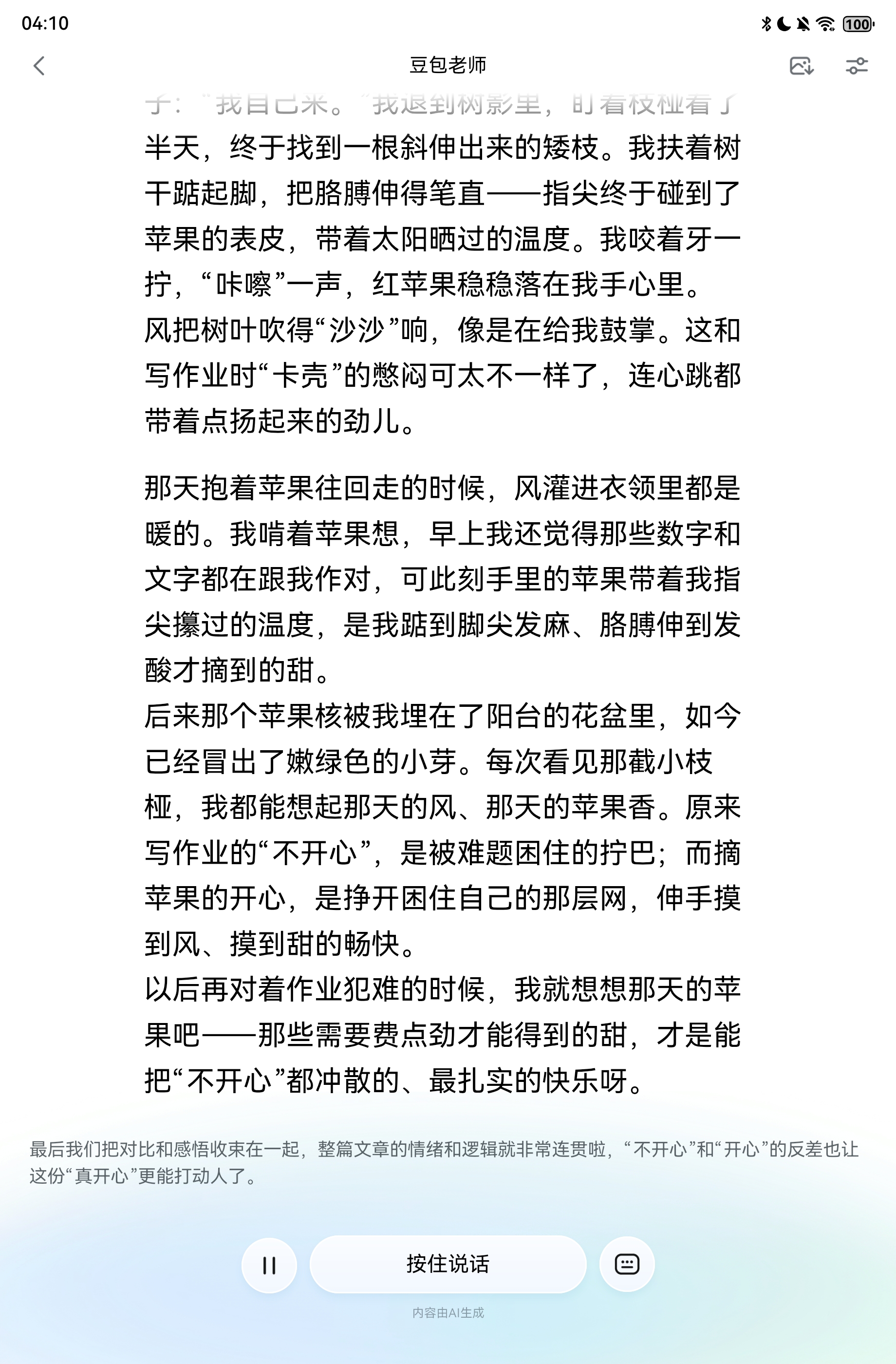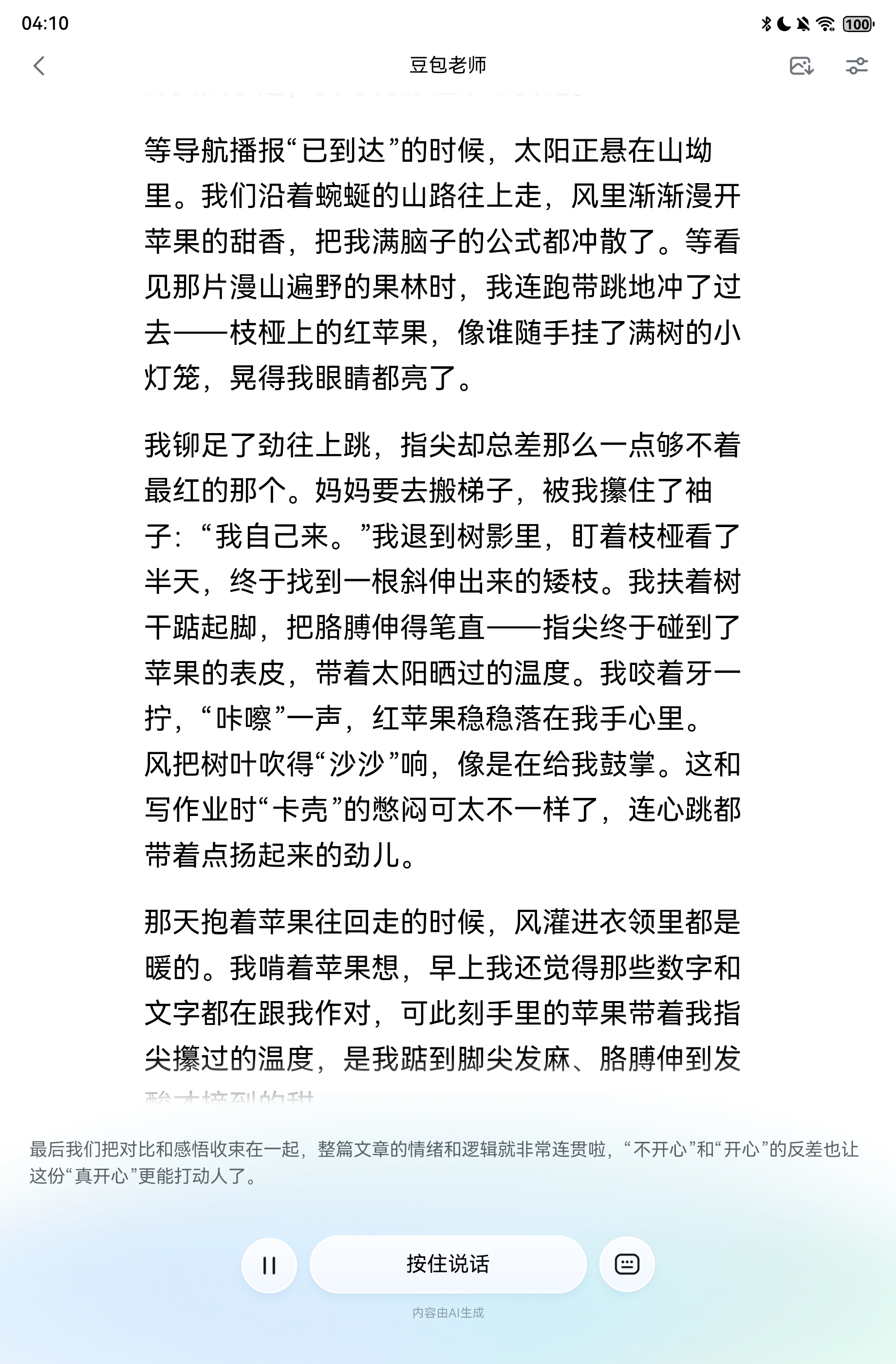 摘果子的细节不错,还可以更丰富一些,我感受到了你的开心,只是略带些浅薄,再想想过程中可否有什么感悟让你更开心呢