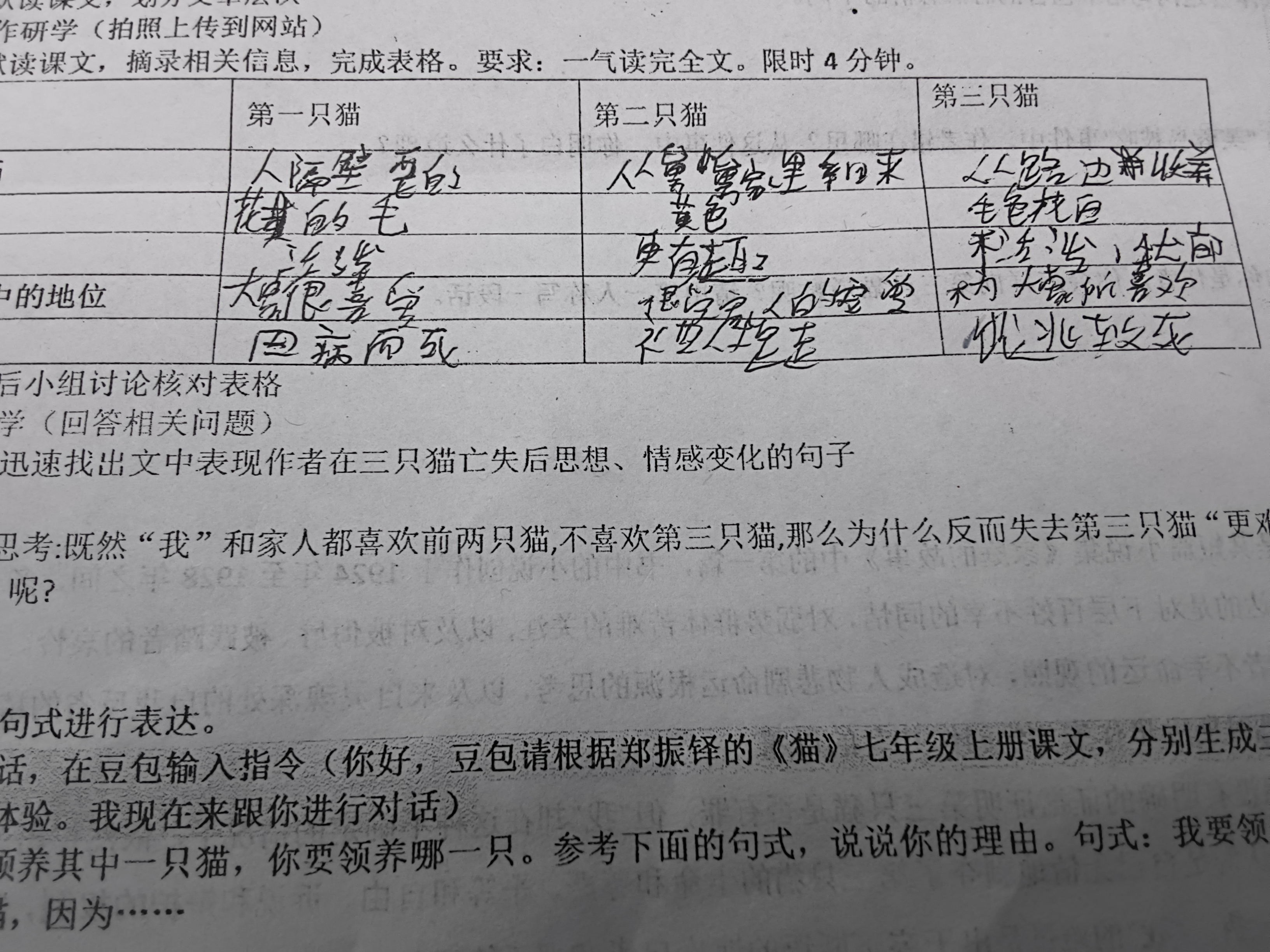 当前位置:合作研学 -> 默读课文,填写表格 -> 七年级15班