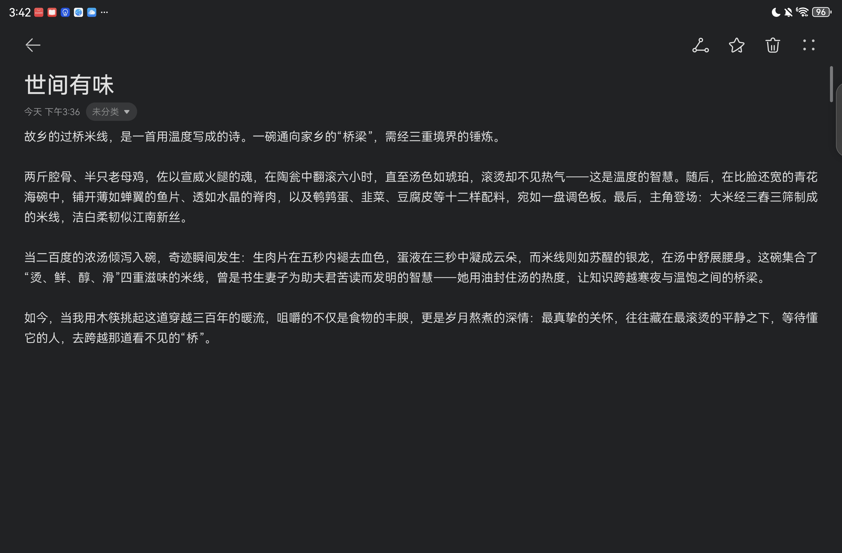 如今,当我用木筷挑起这道穿越三百年的暖流,咀嚼的不仅是食物的丰腴,更是岁月熬煮的深情:最真挚的关怀,往往藏在最滚烫的平静之下,等待懂它的人,去跨越那道看不见的“桥”。